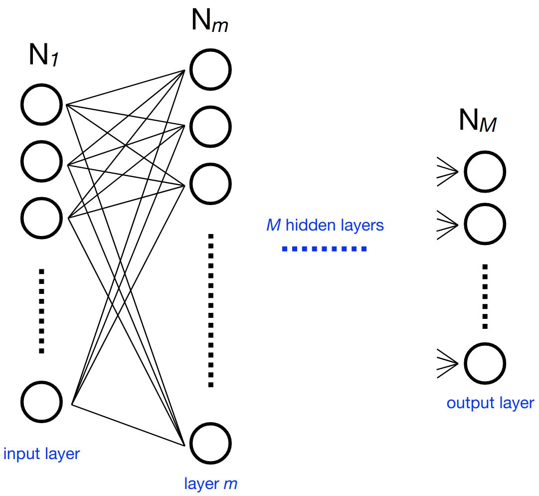 Consider a multi-layered neural network. At each neuron in a layer \(m\) (containing \(N_m\) neurons), we calculate an output value (part of the output vector \(\mathbf{x}_m\) of said layer) using the sum of output values of the previous layer multiplied by independent weights for each of these values and a bias value. An activation function is performed on the result to get the final output value for the neuron. Representing the weights as a \(N_m\) by \(N_{m-1}\) matrix \(W_{m,m-1}\), the bias values as \(\mathbf{b}_m\), and the activation function as \(g_m\), we can express this compactly as: